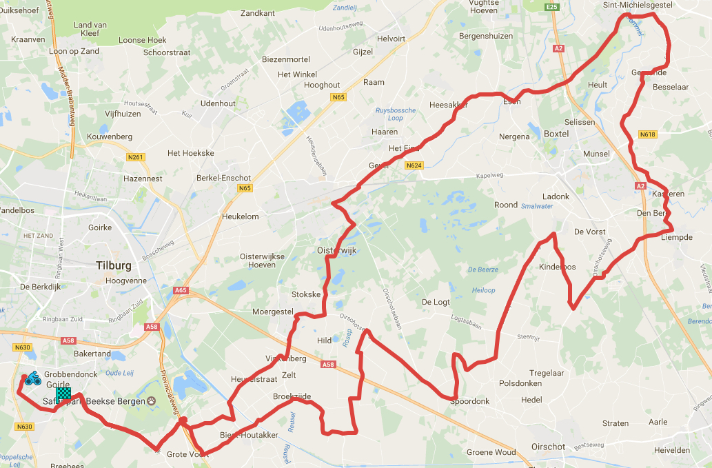 Toerrit die ons brengt naar Hilvarenbeek, Biest-Houtakker, Spoordonk, Liempde, Langenberg, Gemonde, Sint-Michielsgestel, Esch, Haaren, Oisterwijk, Moergestel, Tilburg en weer terug in Goirle. |
