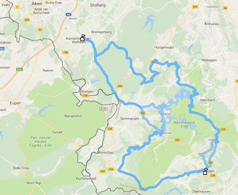We rijden in het gebied ten zuidoosten van Aken en starten in het plaatsje Kornelimünster. De route laat zich kenmerken door mooie vergezichten en kabbelende riviertjes zoals de Ruhr. De rasklimmers krijgen net voor de pauze de felste klim geserveerd van 18%. Tijdens de pauze kun je genieten van een flink stuk appelgebak. Fietstechnisch gaat het om lange (5 tot 8 kilometer) geleidelijke beklimmingen op overzichtelijke wegen met een prima wegdek. Bij deze tocht wordt aanbevolen om na de tocht nog even kort het plaatsje te bezoeken. Een echte aanrader (heerlijk Weizenbier).