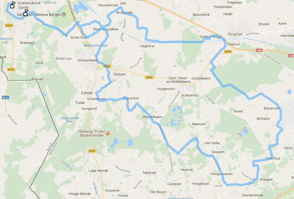 Via Biest-Houtakker, Haghorst, Oirschot, langs vliegveld Welschap, Wintelre, Zandoerle, Knegsel, Vessem, Westelbeers, Esbeek, Diessen, Hilvarenbeek en Biest-Houtakker terug naar Goirle. |